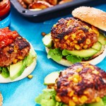 Mmm, ljuvligt goda burgare där färsen blandas med söta och krispiga majskorn! Med tillbehör som avokado, chunky salsa, krispsallad och ugnsrostad klyftpotatis blir detta en smakfest för hela familjen!