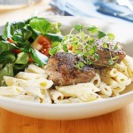 5. Servera biffarna med den krämiga pastan, sallad och bröd.
